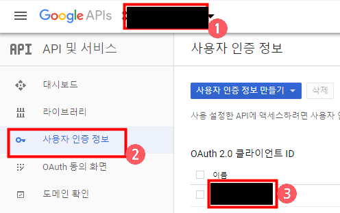 - https://console.developers.google.com/apis/credentials 이동하여 해당 프로젝트를 선택