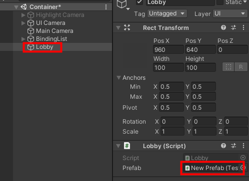 아래 그림처럼 Lobby 게임오브젝트에 New Prefab이 바인딩되어있고